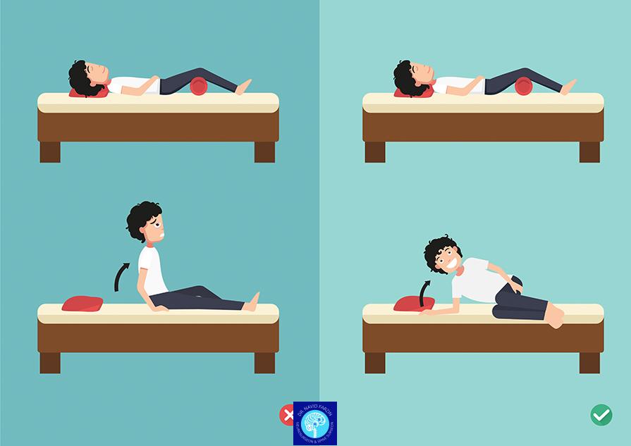 - بایدها: هر ساعت ۵-۱۰ دقیقه راه بروید. برای برخاستن از تخت، ابتدا به پهلو بچرخید، پاها را پایین بیاورید و با کمک دستها بنشینید.